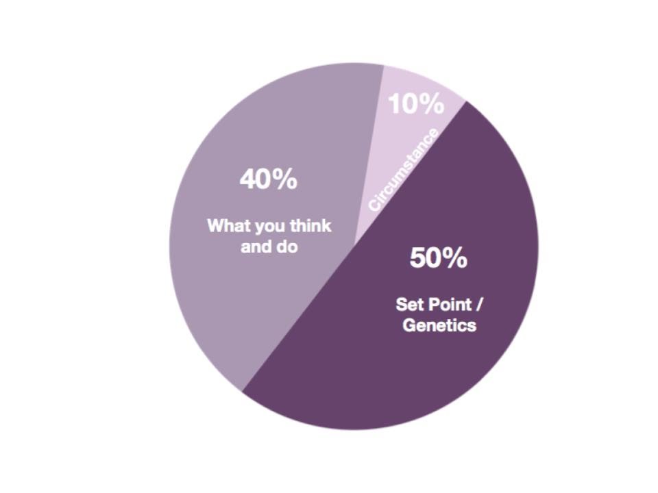 Research shows that you and I are born with 50% of our happiness already built-in via our genetics. Only 10% comes from external circumstances like your possessions, status, money etc., in other words – stuff. A whopping 40% of our happiness is down to how you think about stuff and how you do stuff. It shows that happiness has very little to do with ‘things’, but more to do with how you think and act.